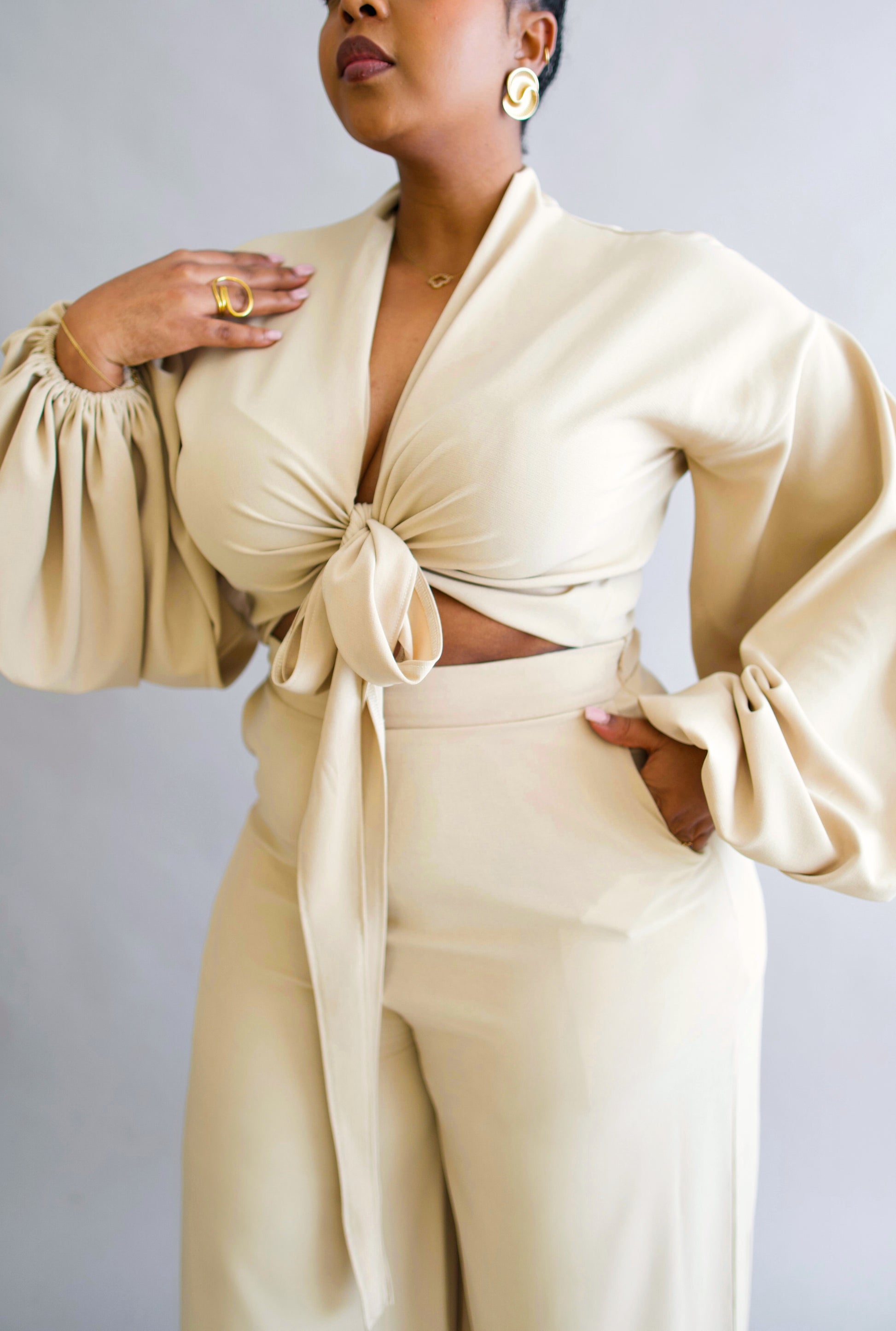 Stylishly wrapped and ready to go, ALORÄ will certainly be your go-to! Loose fabric ties, bishop sleeve cuffs, and wide leg pants in a flattering linen fabrication are just some of the details that elevate her design. Perfect for those summery days at brunch or by the beach.
